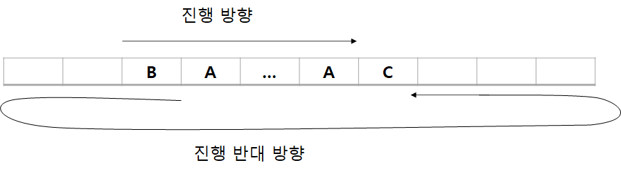 현재 위치가 'B'라고 했을 때, 진행 방향에서 'C'는 'B' 이후 처음으로 'A'가 아닌 알파벳이 된다. 그리고 진행 반대 방향에서 보았을 때 'C'는 'B' 이후 마지막으로 나타나는 'A'가 아닌 알파벳이 되는 것이다. 'B'에서 'C'까지 진행 반대 방향으로 이동하면 그 사이에 있는 모든 'A'가 아닌 알파벳은 수정이 가능하다.